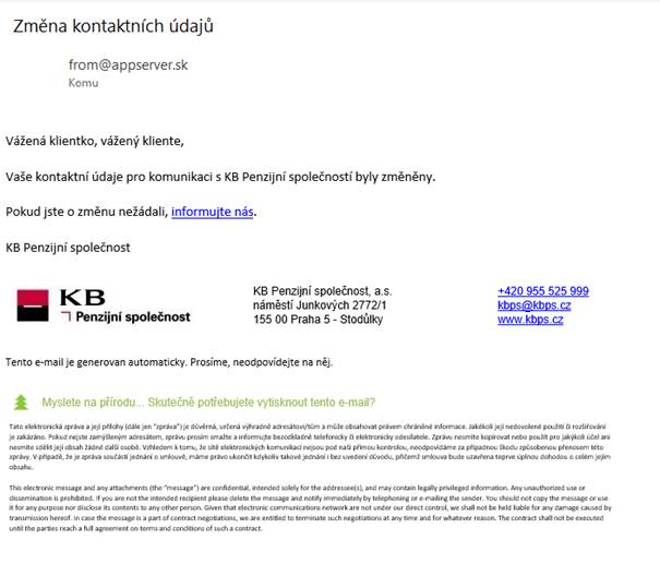 - jedná se o proceduru zabezpečující ochranu při provádění změn smlouvy. Před uložením a odesláním dokumentu do KB PS je na mobilní telefon účastníka doručen bezpečnostní kód (zobrazuje se jako SMS zpráva). Tento kód slouží k ověření totožnosti účastníka, který provádí úpravu smlouvy. |