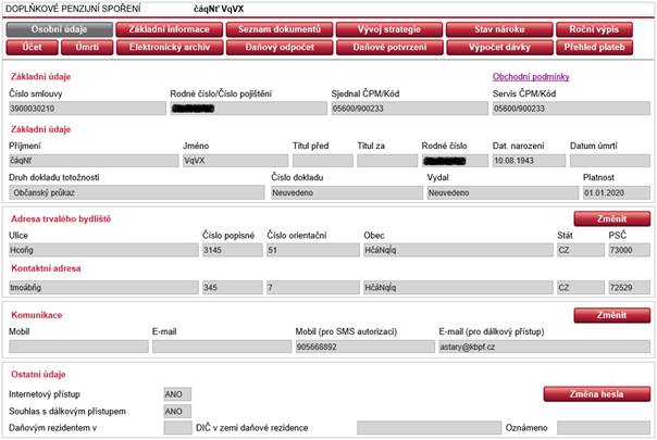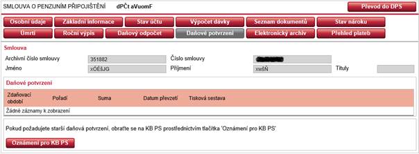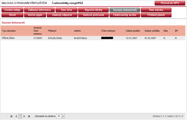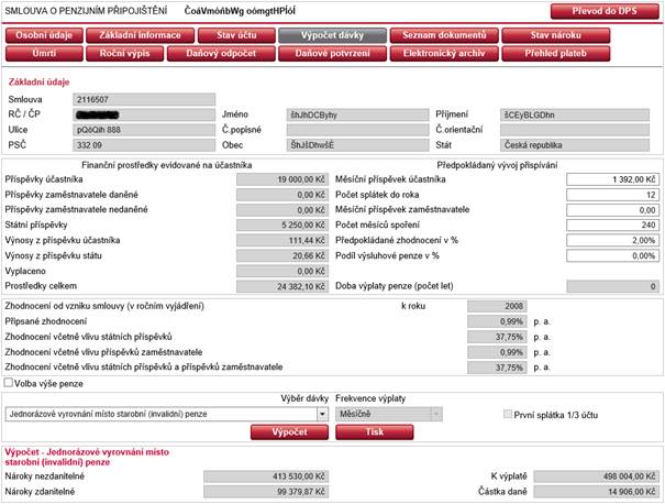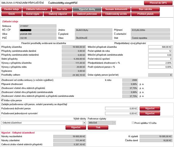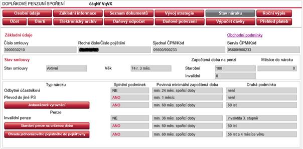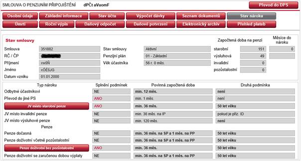 · stav NÁROKU – údaje o stavu smlouvy, započtená doba pro jednotlivé penze a podmínky pro vznik nároku na odbytné, převod a jednotlivé penze (Obrázek 85)