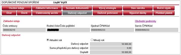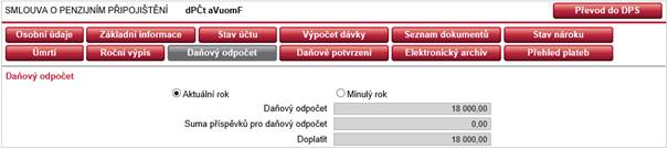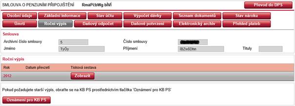 · tisk aktuální smlouvy – vygeneruje dokument Aktuální přehled vybraných údajů smlouvy o penzijním připojištění. Tisková sestava se vytváří v IS GARANT z údajů evidovaných v tomto systému. Detail stavu účtu – otevře sekci Stav účtu