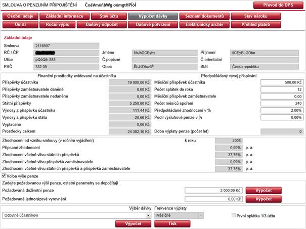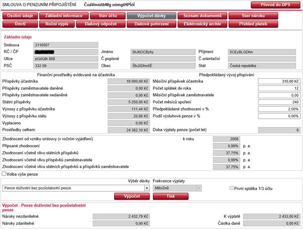 · výpočet – provede výpočet dávky pro aktuální stav smlouvy, evidované finanční prostředky a nastavené parametry pro vybranou dávku