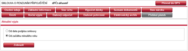 Sekce vygeneruje výstupní sestavu Aktuální stav účtu účastníka DPS. Nejprve se otevře okno pro nastavení parametrů – zobrazení dat buď od podpisu smlouvy anebo od začátku minulého roku.