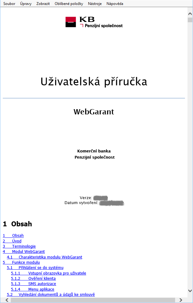 Základní obrazovka pro práci se smlouvou (na tuto obrazovku je možné se dostat odkudkoli přes horní lištu, tlačítko domů) - dlaždice Podrobný manuál (Obrázek 50). Otevře se okno internetového prohlížeče s touto příručkou k WebGarantu (Obrázek 91).