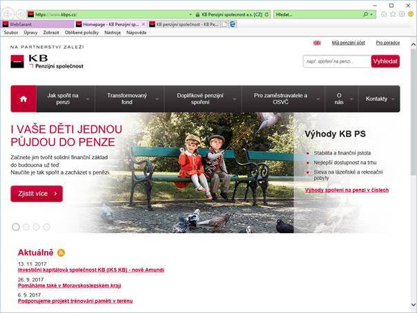 Modul WebGarant slouží na rozšíření nabídky poskytovaných služeb účastníkům doplňkového penzijního spoření (dále pouze účastník KB PS) nejen na kontaktních místech KB PS (tj. u vyhrazených přihrádek KB), ale na libovolném místě s přístupem na internet. Modul je řešený jako internetová aplikace a umožňuje uživatelům (účastníkům, dealerům, pracovníkům KB PS, pracovníkům expozitury KB) připojeným na internet s delegovanými právy pracovat nad vybranými údaji o klientovi KB PS.