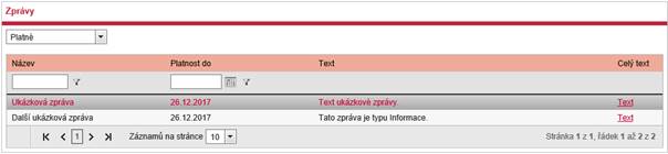Základní obrazovka pro práci se smlouvou (na tuto obrazovku je možné se dostat odkudkoli přes horní lištu, tlačítko domů) - dlaždice Zprávy (Obrázek 50). Otevře se okno se zobrazením všech platných zpráv zaslaných danému typu pracovníka administrátorem (Obrázek 94) s možností přepnutí na zobrazení všech zpráv určených dané roli uživatele. Po kliknutí na Text u dané zprávy se otevře okno s detailním zobrazením této zprávy (Obrázek 95).