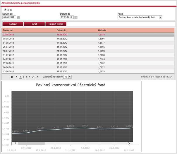 Menu různé --> zobrazení ahpj. Otevře se okno zobrazující hodnoty penzijní jednotky pro vybraný fond za vybrané období.