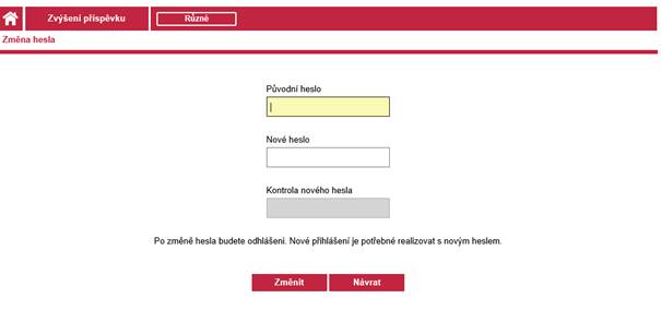 · Změnit – zapsání nového hesla a otevření vstupní obrazovky pro první přihlášení se s novým heslem (Obrázek 98)